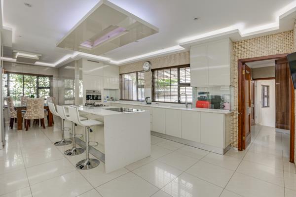 Situated in a secure, boomed-off street in the prestigious suburb of Bryanston, this elegant 5-bedroom family home offers a perfect blend of luxury, comfort, and space on a full acre of landscaped grounds.