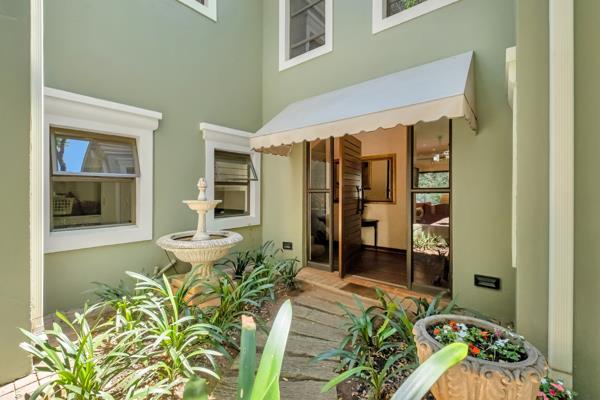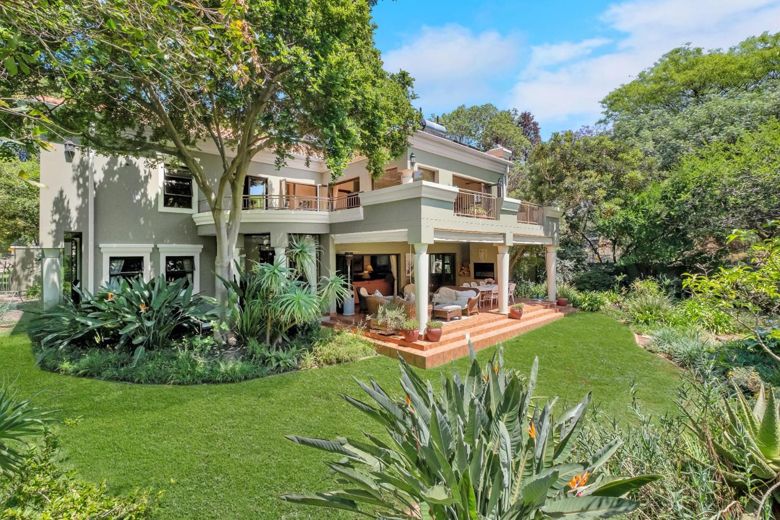 The covered patio is designed for year-round enjoyment with a Jetmaster gas braai and roll-down awnings. It overlooks the beautifully landscaped wraparound garden, where a pond feeds into a stream, creating a soothing natural backdrop.