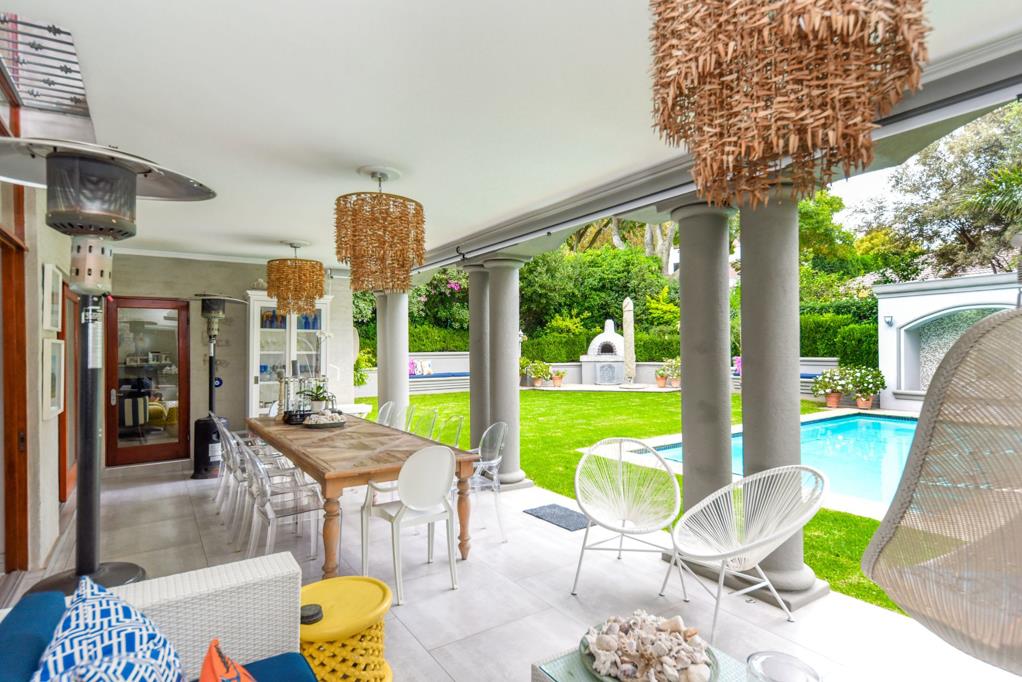 The welcoming entrance leads left into the formal lounge with a cozy wood-burning fireplace, and right into the impressive double-volume dining room. At the heart of the home lies the kitchen, featuring wrap-around granite countertops, an electric stove, prep bowl, and extractor fan, with a scullery that neatly accommodates two appliances. Flowing seamlessly into the family TV room, all three receptions open onto the covered patio featuring electric blinds, lush landscaped garden, sparkling solar-heated pool, and a wood-burning pizza oven, creating the ultimate indoor-outdoor lifestyle.