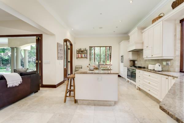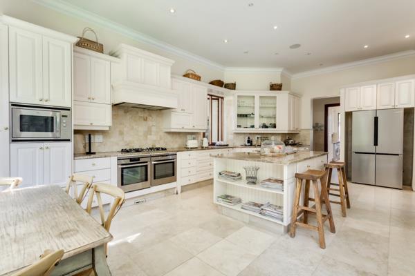 At the heart of the home lies a designer dine-in gourmet kitchen, generous in scale and beautifully appointed with a large central island ideal for meal preparation, casual breakfasts, or relaxed conversation. The kitchen is equipped with a gas hob, dual ovens, and breakfast counter, and flows effortlessly into a walk-in scullery and pantry, ensuring functionality and discreet elegance for the modern entertainer.