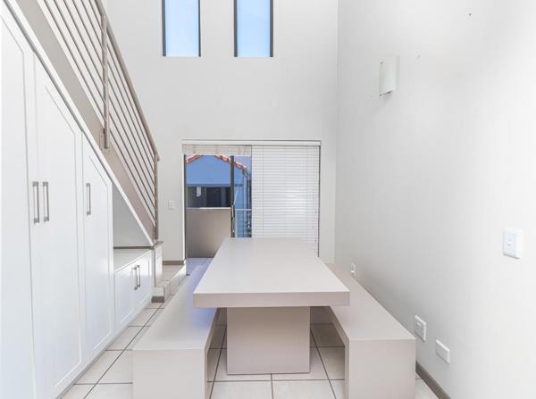 Step into a bright, hardly every been lived in, open-plan living space featuring a sleek kitchen with Caesarstone countertops, a movable center island, and space for two appliances, plus a fridge. The dining area features custom-made cupboards built into the space under the staircase for additional storage and flows effortlessly onto a private balcony, perfect for unwinding with a stunning view.