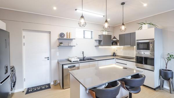 The contemporary kitchen features sleek cabinetry and black matt finishes that a touch of refined sophistication. Special lighting above the breakfast counter. Place for dishwasher, washing machine and tumble dryer. Under counter lights and caesar stone tops also comes with built in oven and microwave.The space opens easily into the sunlit lounge and dining area, creating a warm, inviting atmosphere ideal for both relaxing and entertaining.