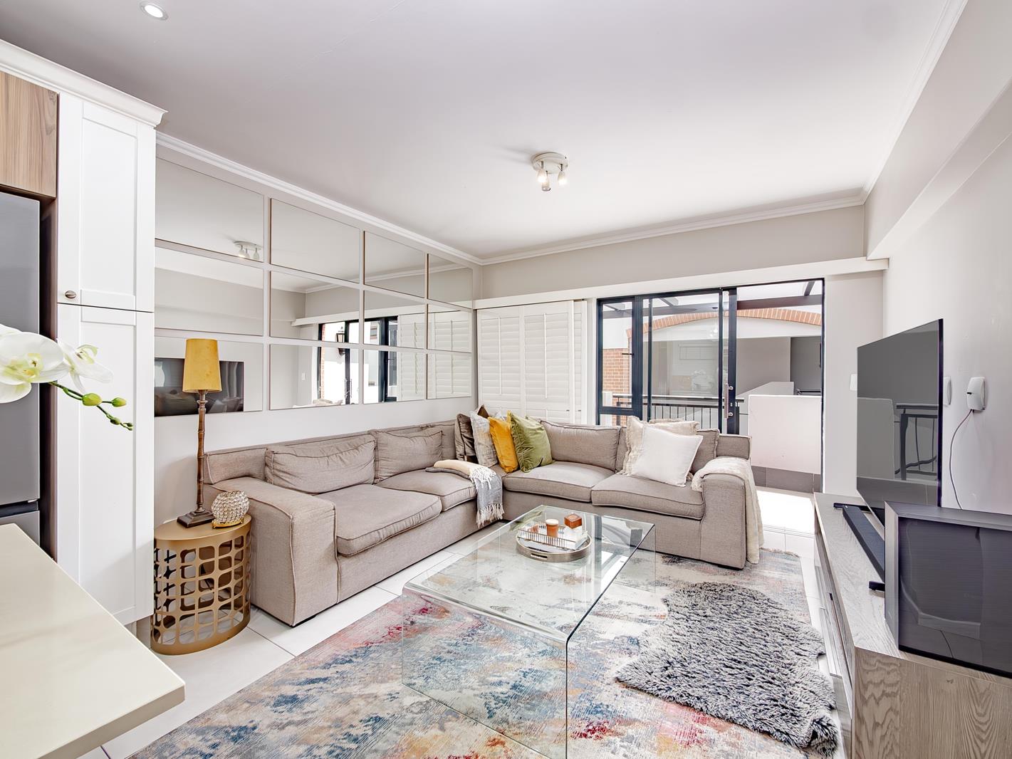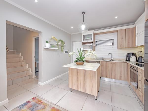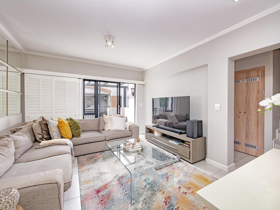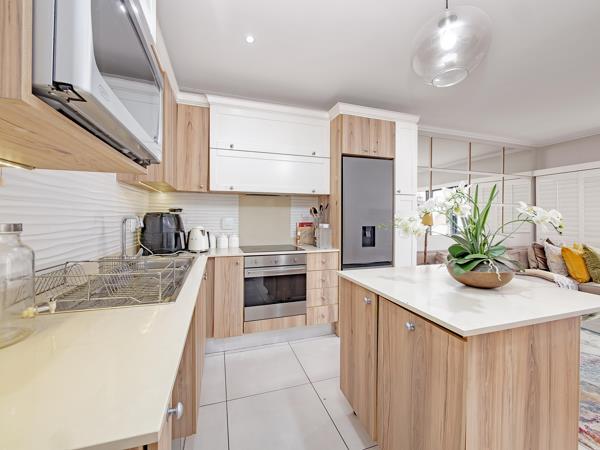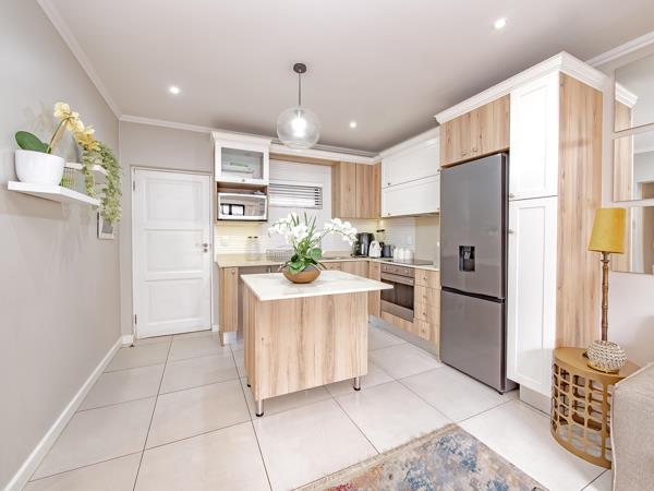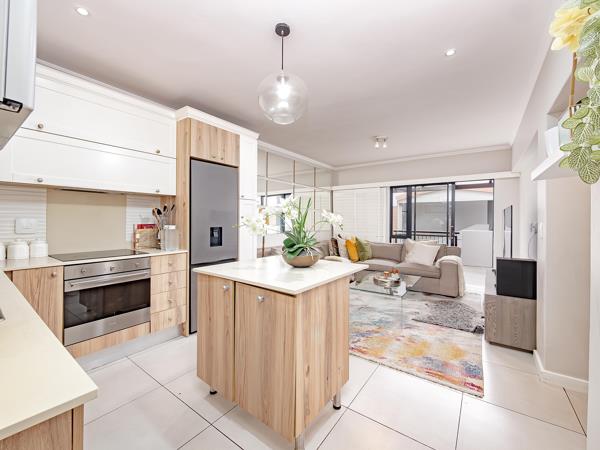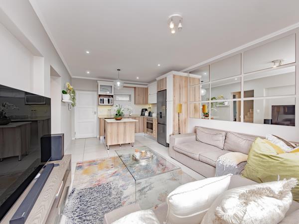 The open-plan layout hosts a modern kitchen with a centre island and a Smeg oven flowing into a spacious lounge area that extends onto a private balcony. Also on this level is the second bedroom with built-in cupboards, positioned close to a full bathroom, which doubles up as the guest bathroom. The spacious main bedroom is upstairs complemented by a generous walk-in closet and a second full bathroom on this floor. One of the standout features of the apartment is the expansive private balcony on the upper level the perfect space for relaxing, entertaining, or enjoying a braai.
