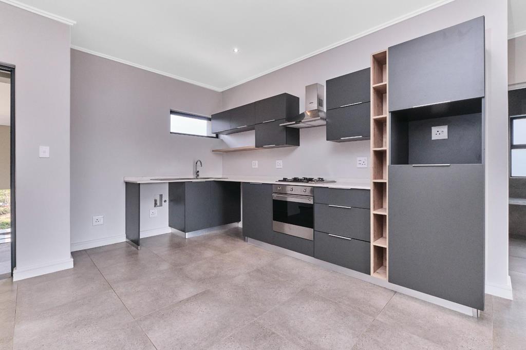 The kitchen features elegant dark finishes and is fully equipped with Smeg appliances, including a built-in microwave, gas hob, extractor fan, and two water service points. Additional conveniences include fitted blinds, a backup inverter, and a heat pump and geyser combination to ensure efficient hot water supply.