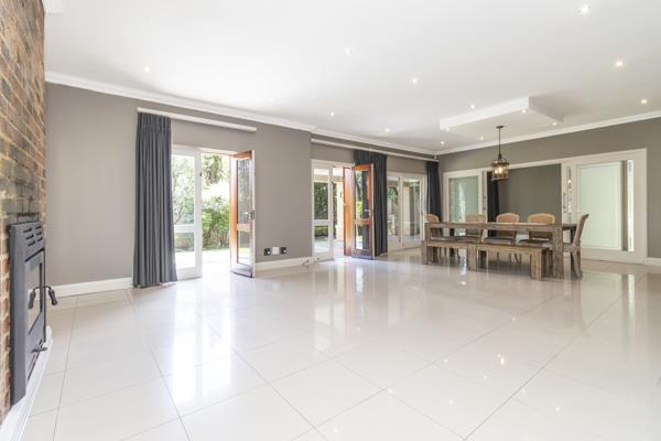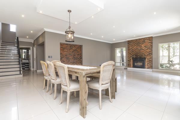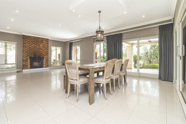 The generous reception areas include a spacious lounge with a combustion fireplace and dining room, both opening onto a covered patio with built-in braai. The patio overlooks a landscaped garden, sparkling swimming pool with cover and safety net, and an additional outdoor entertainment area complete with a firepit ideal for relaxed family living and entertaining year-round. A second informal reception area flows off the kitchen, enhancing the homes open-plan design.
