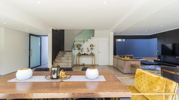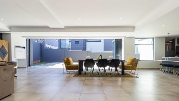 Upon entry you are welcomed by a vast reception area that seamlessly integrates the lounge and dining room with the kitchen and outdoor patio. The kitchen features quartz tops, high-gloss grey cupboards, gas and a breakfast bar, scullery separate.Double volume, staircase, Inverter, high-speed internet, excellent security, large main bedroom with walk in cupboards and en-suite bathroom. Three more well appointed bedrooms en-suite to follow, plus spacious pyjama lounge, all upstairs.