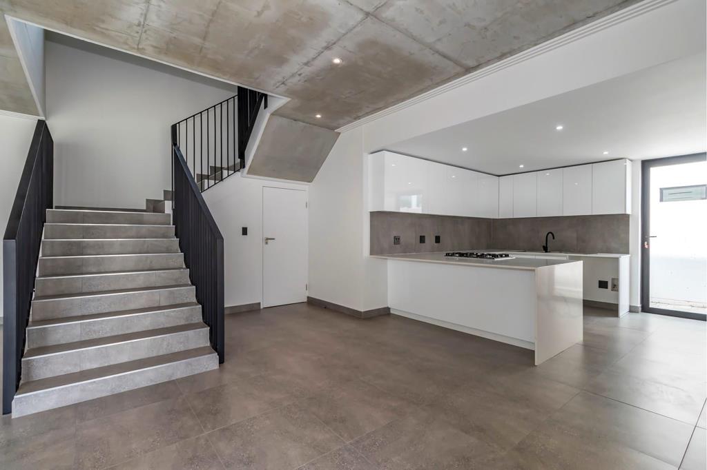 One enters the property through the front gate, walking down pavers to the front door. Enter through the glass front door to a large open plan living area with enough space for a lounge and dining area. Glass stacker doors at the front and back of this living area allow for plenty natural light and air to flow through. The large covered patio has a cleverly built in space for your braai of choice which enables one to comfortably entertain your guests or enjoy al fresco dining with your family overlooking an easy to maintain garden. Guest bathroom cleverly tucked away under the staircase. The kitchen is ultra modern with quartz counter tops, matt black accessories, both dishwasher and washing machine ready, space for tumble dryer, gas hob, and a designated area for the double door fridge. Plenty cupboard space. The back door leads out to the domestic accommodation with en-suite bathroom.