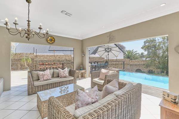 Open-plan kitchen, lounge, and dining area with seamless flow to a generous covered patio and built in braai an entertainers paradise overlooking the rim-flow pool