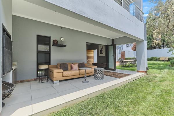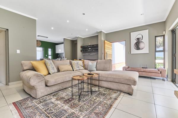The spacious open-plan living area features a modern kitchen with top-of-the-range appliances, a centre island and a generous dining area ideal for the aspiring chef. The lounge with a cosy fireplace flows seamlessly onto a covered patio with a built-in braai, perfect for year-round entertaining. Large aluminium stacking doors open to a beautifully landscaped garden, creating a natural indoor-outdoor connection. The ground floor also includes a guest cloakroom for convenience.