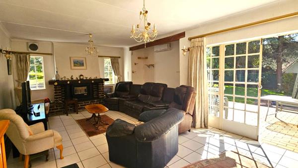 * Large lounge with gas fireplace and glass doors leading to the garden