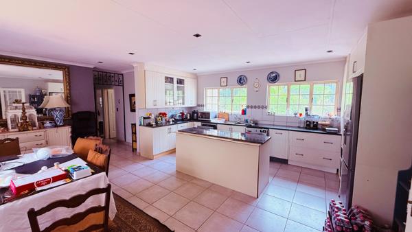 At the heart of the home lies a modern kitchen with a central island, perfect for family gatherings and effortless entertaining. The dining area opens through sliding doors onto the patio, seamlessly connecting the indoor and outdoor spaces. From there, enjoy views of the sparkling swimming pool and expansive garden, ideal for hosting guests or relaxing in the sunshine.