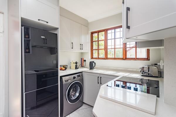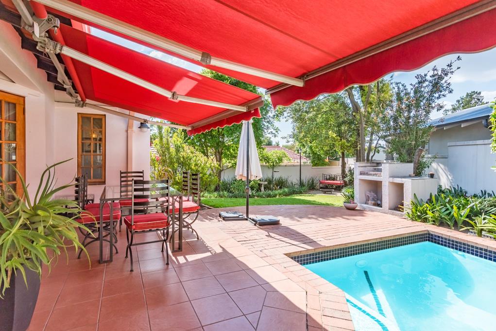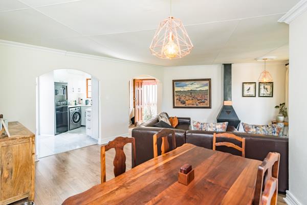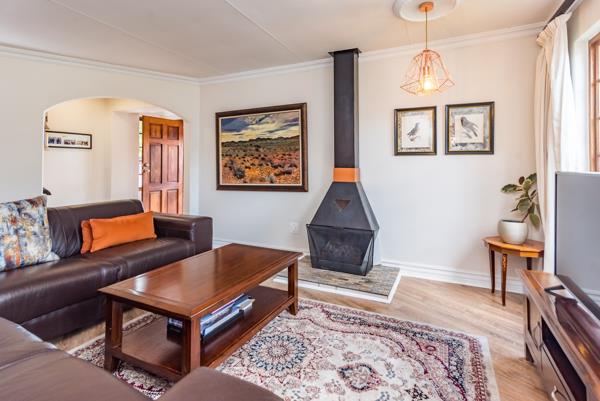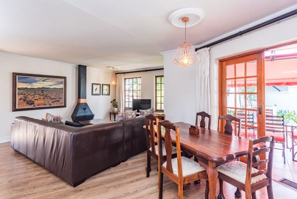 The light-filled living area, finished in pristine wood laminate, flows seamlessly from the entrance hall through to the lounge with its cosy wood-burning fireplace and the dining area that opens onto a sunny patio. The pull-out awning provides shade for relaxed afternoons overlooking the sparkling pool and manicured garden complete with braai facilities for easy entertaining.