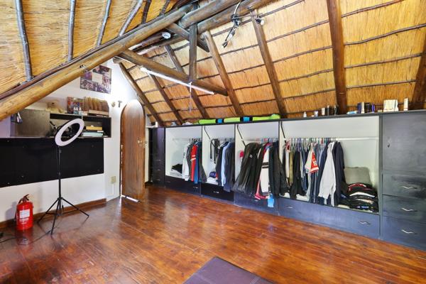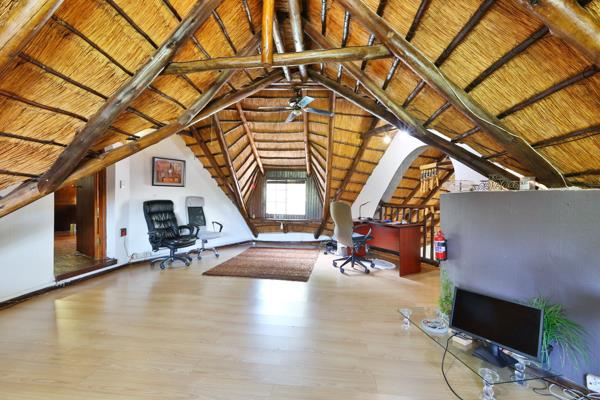 This expansive residence boasts six comfortable bedrooms and four bathrooms, including two en-suite facilities, plus a guest toilet. Unique loft spaces, with their thatched roofs and exposed beams, provide versatile areas, currently an office, offering extensive built-in storage. A dedicated study, staff quarters, and a separate flatlet further enhance the property''s versatility.