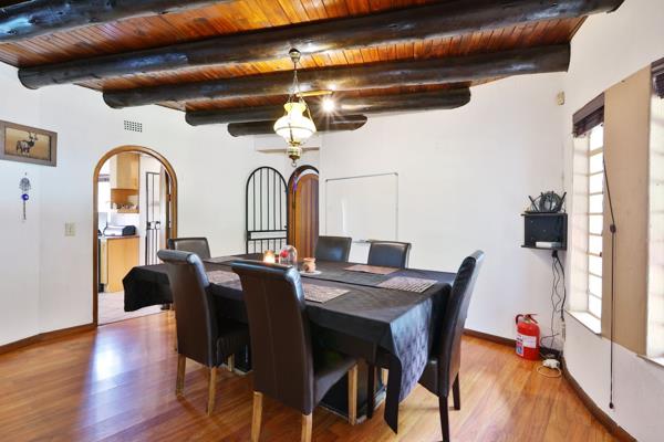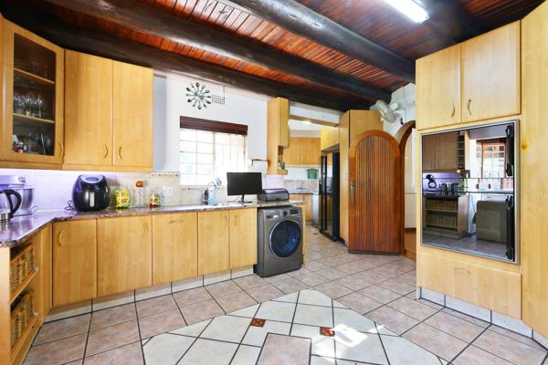 Discover a truly unique home in Buccleuch, Sandton, defined by distinctive thatched ceilings and exposed wooden beams creating a rustic ambiance throughout. The spacious living areas feature light wooden flooring, white walls, a striking split-level design, and a mezzanine balcony overlooking the main lounge, complete with a cozy fireplace. The functional kitchen offers ample light wood cabinetry, a built-in oven, gas hob, tiled flooring, scullery, and pantry. An elegant dining room, also with rustic beams and arched doorways, completes the main living spaces.