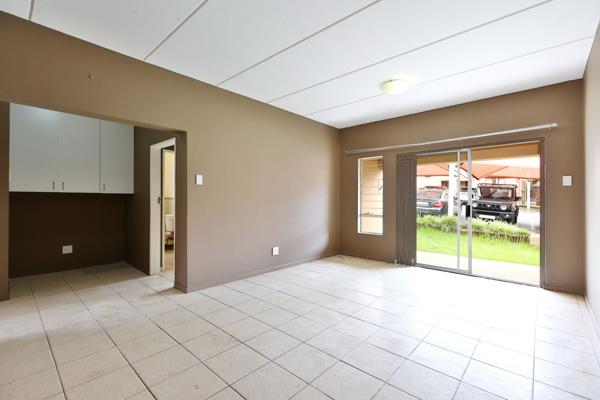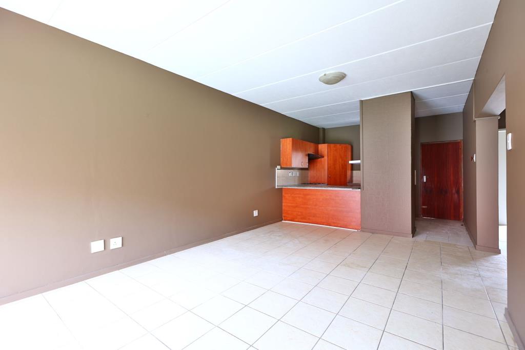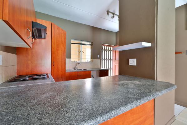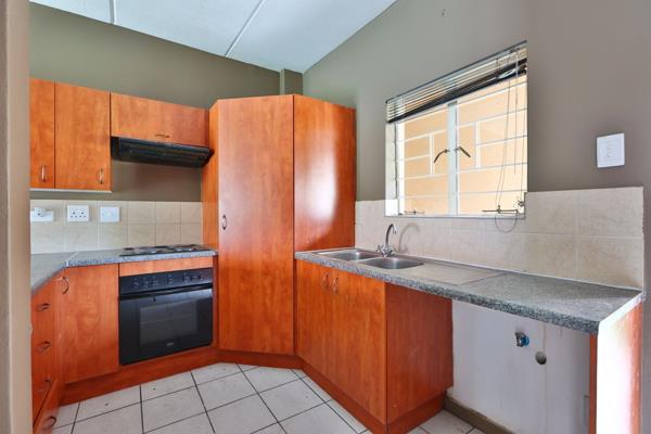 Neat kitchen with ample cupboard space. Open plan lounge leading onto an outside patio facing the communal garden.