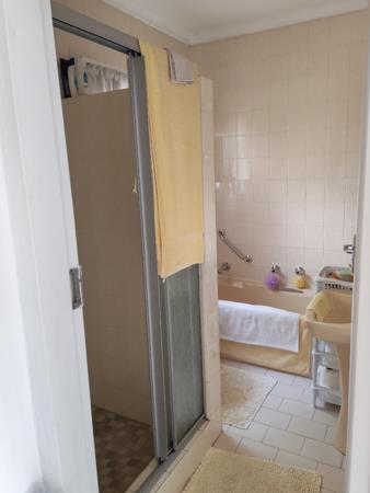 Step inside to an inviting open-plan living and dining area, characterized by bright white tiled flooring and ample natural light streaming through large windows and sliding glass doors. The vaulted ceiling in the living area enhances the sense of space, while the modern glass dining set adds a touch of contemporary elegance. The functional kitchen is well-equipped to meet daily needs. The single bedroom is a bright sanctuary, featuring a large window that offers pleasant green views and is fitted with security bars for peace of mind. The bathroom is fully tiled and includes both a separate shower stall and a bathtub, complete with a safety grab rail.