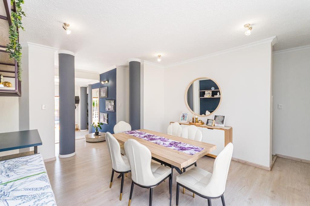 Elegantly designed, the home offers spacious living areas with views of the pool and garden, adorned with tasteful paint effects. The en-suite bedroom boasts laminate flooring and a mirrored wall of cupboards, while high ceilings and down lights enhance the ambiance. Enjoy the comfort of air conditioning, abundant natural light from numerous windows, and a patio-style door that seamlessly connects indoor and outdoor spaces.