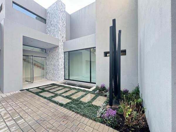 An amazing architecturally designed home, standing proud in a hue of emerald green and colorful foliage with sparkling pool in a garden landscaped to perfection