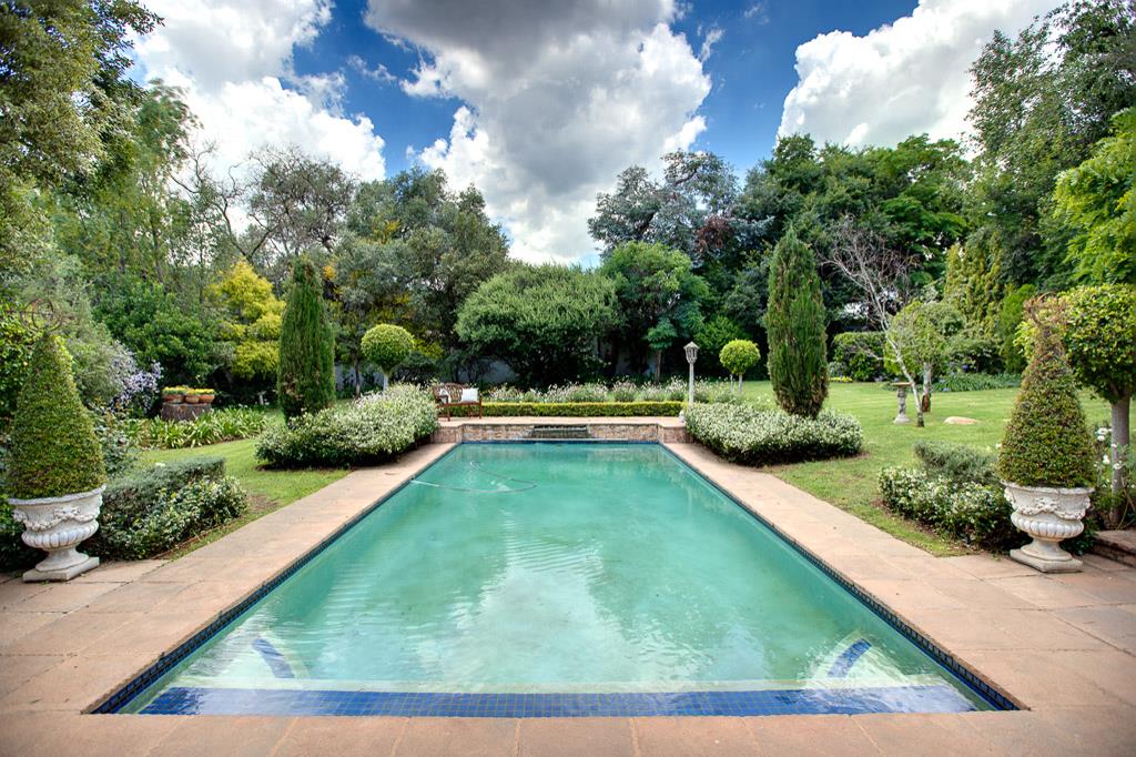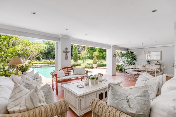 Enter through double doors into the welcoming entrance courtyard, flanked by the bedroom wing on one side and the reception wing on the other. From here, step into the spacious open-plan lounge and dining room, both opening through French doors to a double patio, sparkling pool, and gorgeous landscaped garden. A combustion fireplace anchors this space, making it ideal for all seasons.