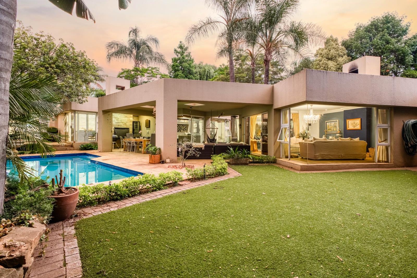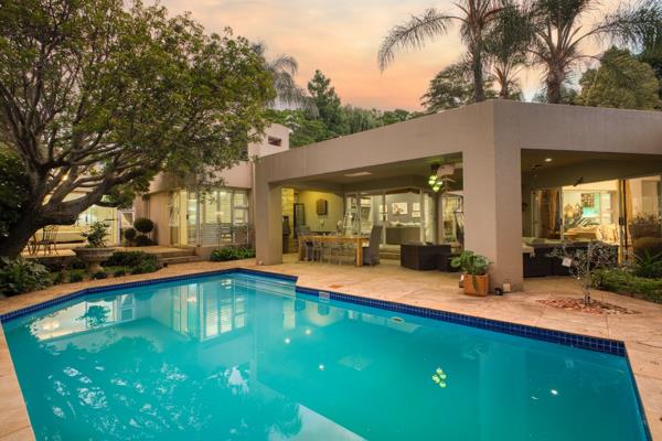 A closed wood-burning fireplace warms the lounge, while the solar-heated pool sparkles in the low-maintenance garden. The Caesarstone kitchen boasts Smeg appliances, a separate scullery, and a cozy breakfast nook.