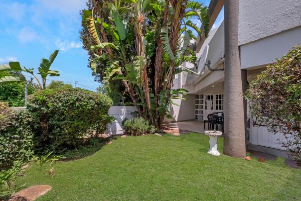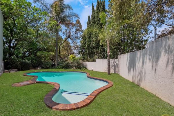 The outdoor area is a true highlight, featuring a private garden with a well-kept lawn, established hedges, and tropical foliage for enhanced privacy. The covered patio is ideal for entertaining or quiet enjoyment, overlooking a sparkling free-form swimming pool. The property also includes a dedicated parking bay and a driveway.