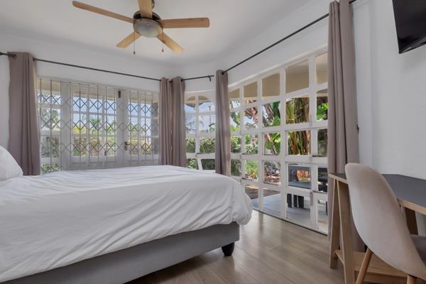 Both bedrooms are thoughtfully designed for relaxation, with the main bedroom offering direct access to the garden through extensive windows and glass doors, alongside a modern en-suite bathroom.