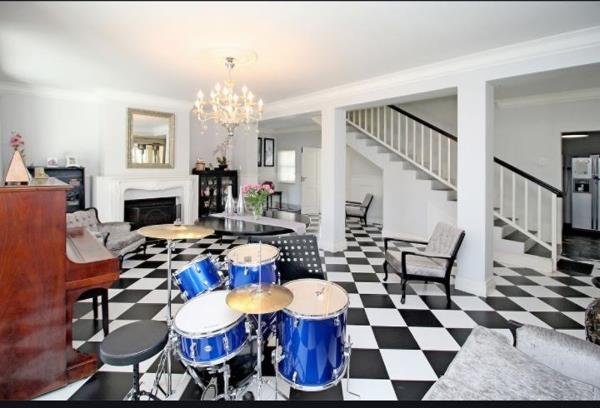 The lounge has elegant black and white tiles and a fireplace. The dining room has parquet flooring and a beautiful chandelier