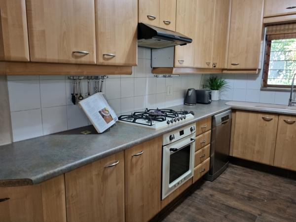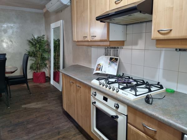 Spacious, fully fitted kitchen, Smeg gas top, oven electric with extractor fan , cupboards to the ceiling, space for double fridge, and 3 appliances.