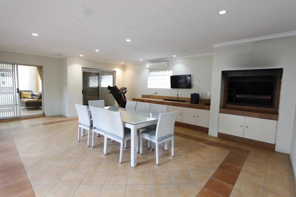 Expansive entertainers covered enclosed patio with built in braai and jacuzzi is amazing for entertaining friends and family. The patio opens to sparkling pool and treed garden.