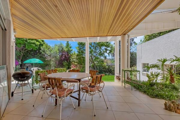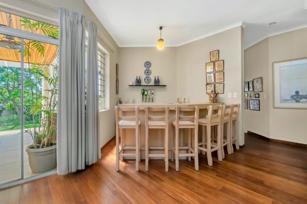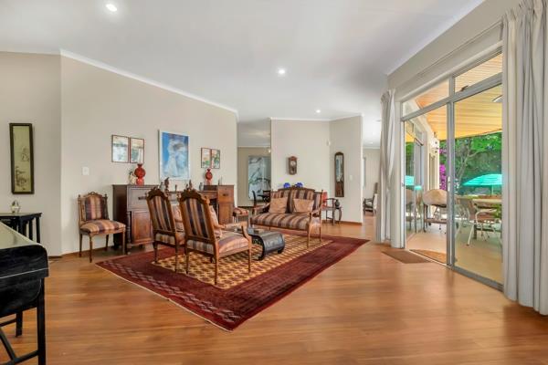 Beautiful garden as one approaches the entrance hall of the home. Cheerful large lounge with bar area and wooden floors, two sets of sliding doors lead out to a big high patio. The sunny patio has wonderful views as ones looks down over the lush garden and sparkling pool. Cosy TV room with built in fireplace and wooden floors. Large private dining room with wooden floors and a big window that looking out in an atrium. The dining room leads into a light big kitchen with a big widow to give lots of light. Scullery on the side of the kitchen with room for two appliances. The scullery leads out in a courtyard and the door from the automated double garage.