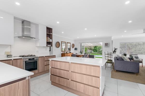 The home is north facing overlooking a large garden and sparkling swimming pool in good condition. Stacker doors lead out from the huge open large lounge, TV, dining, kitchen area onto the patio overlooking the pool and large garden. It is a very bright, light, modern home recently renovated home. With Caesar stone top in the kitchen, Central Island, gas hob, eyelevel oven, prep bowl and new appliances. Modern scullery with room for 2 appliances, lots of cupboards and two door one leading out to the court yard and the other leading into the garage.
