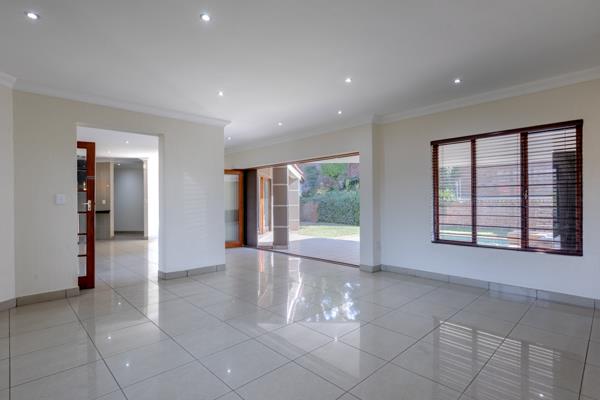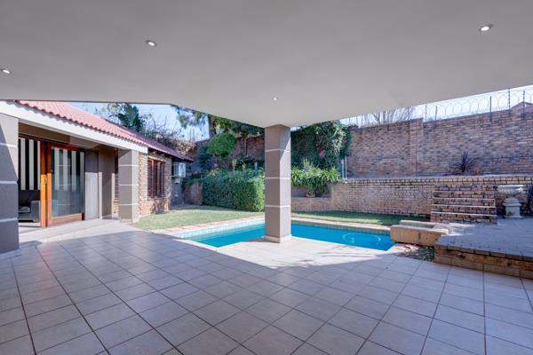 Large sliding doors open onto a covered patio that overlooks a small, landscaped garden and sparkling pool, creating a serene setting for outdoor dining or weekend gatherings. Natural light fills the living spaces, enhancing the warm and welcoming atmosphere throughout.