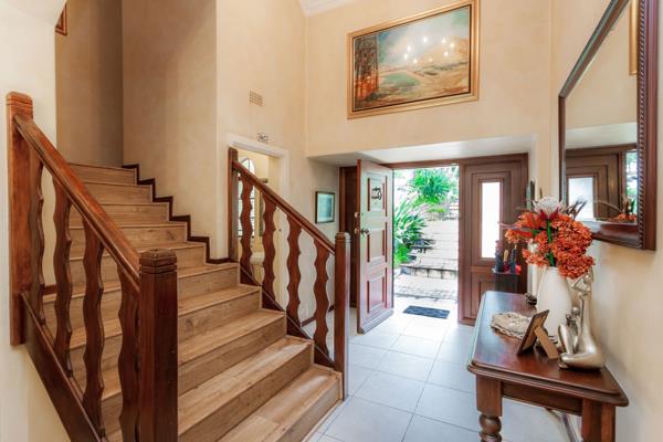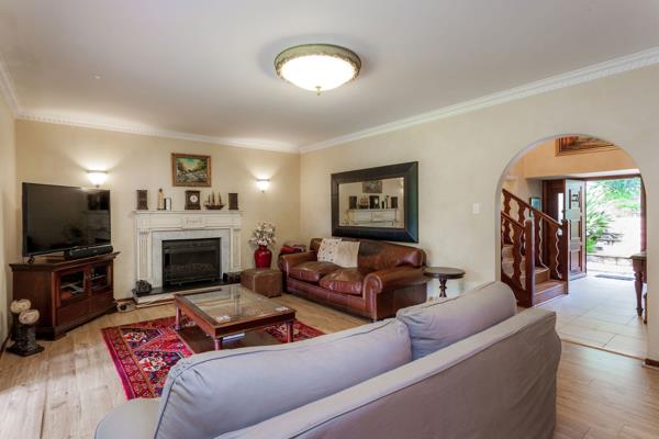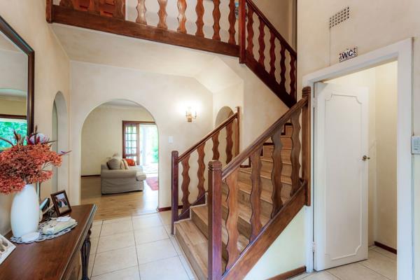 Located in a secure boomed location with 24hr guards. This American colonial-style home with English charm has ample accommodation for large growing families. South entry, north facing, pillared covered patio faces the garden with tall trees, pool and a riverside setting. Country living within the bounds of the city. Easy access to Sandton, Hyde Park, Rosebank and excellent schools.