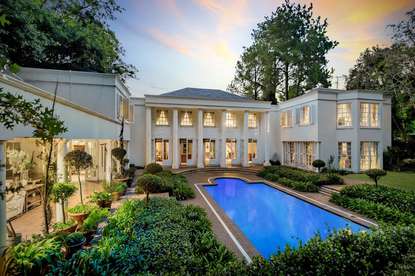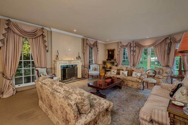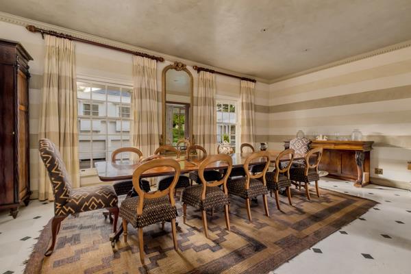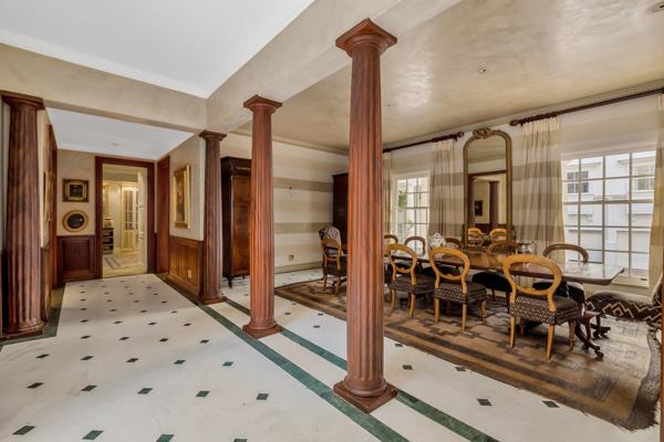 One enters the motor court with colonnade surround, up a double stairway with balustrade to the double front doors. The reception area has marble flooring and tall French doors with cremonese fittings opening out to the garden and pool. The grand formal lounge has a fireplace with bespoke mantelpiece and surround, large sash windows on three sides. The formal dining room has pillars between it and the tall French doors to the garden, and sash windows onto the motor court.