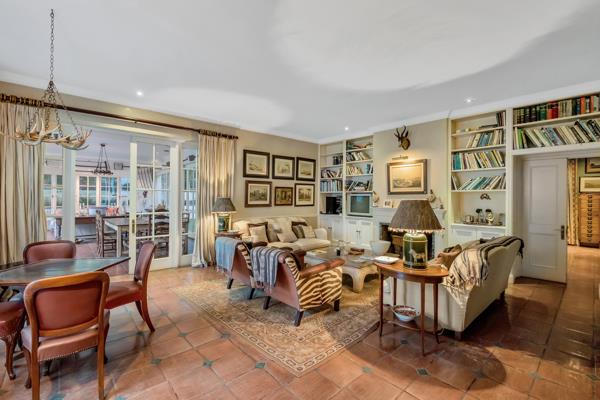 The covered entertainment patio with a central wrought iron candle light fitting, and ample space for lounge and dining suites, is enclosed on three sides, with glass sliders onto the garden on one side and is open to the pool and garden on the other. The attractive kitchen has granite surfaces and white fittings with occasional contrasting wood, central island with prep bowl and wood chopping block, plus an overhang for decorative pots and utensils. The Ilve stove has double ovens, electric hob and extractor fan, plus there is a Gaggenau griller and fryer. A breakfast area is situated in front of double French doors onto the garden and has a lovely outlook. The scullery/laundry has space for three appliances and a walk-in cold room.