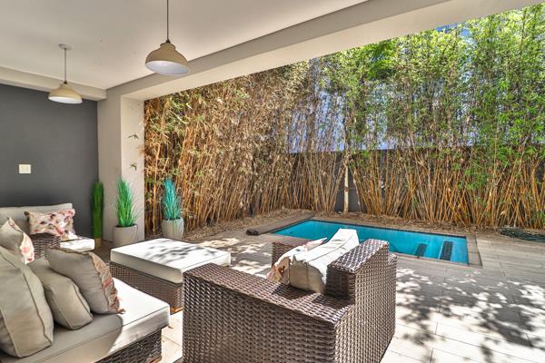 Separate lounge area opening onto a private garden with a sparkling splash pool.