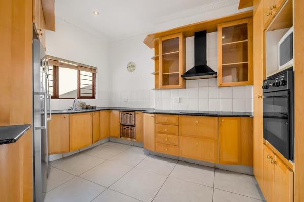 The spacious Kitchen has a serving hatch to the Dining Room and is fitted with wood cupboards and black granite countertops, glass hob and eye level oven (both electric), extractor fan, prep-bowl, double sink, space for a separate fridge and freezer, and space for two under counter appliances.