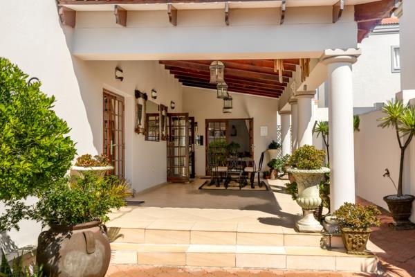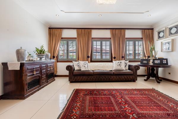 Entrance into the tiled open plan living area, gas fireplace and wooden double doors opening onto a lovely entertainment covered patio. The kitchen is open plan to the living area with granite countertops and a separate scullery allowing for 3 appliances. Family room, tiled, with doors opening onto the patio. Study. Guest bathroom with bath, vanity, shower and loo.