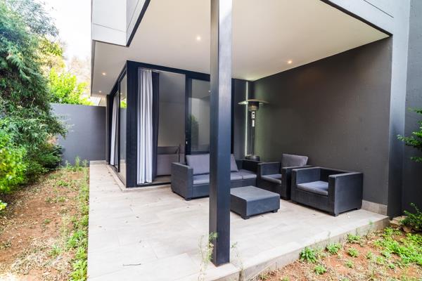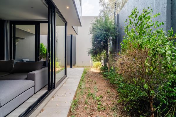 This living area flows seamlessly out onto the private, ornate garden space and sheltered patio owing to the expansive floor-to-ceiling sliding doors.