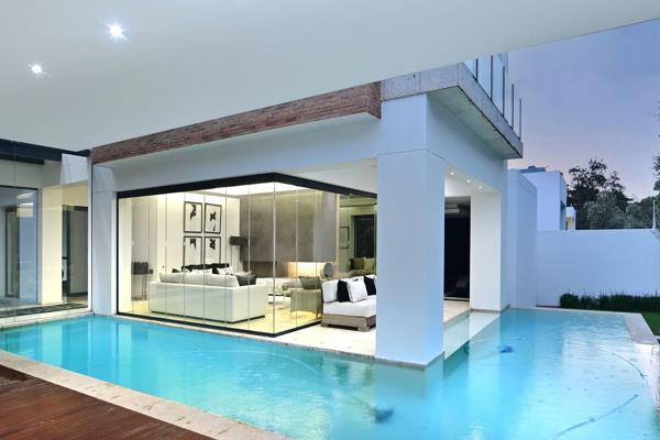Exciting cutting edge Architecture where interior and exterior spaces integrate in a enticing display of fluidity, designed with majestic double volumes, baronial spaces, perfect proportions and symmetry, bold, original, clean lines, enormous windowscapes which allow the interior spaces to intergrate with the exterior spaces - with exotic lush gardens , water features and the rim flow pool .