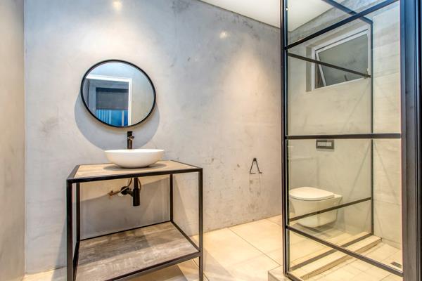 The en-suite bathroom is a statement in itself featuring an elegant oval bath, wrapped in black stainless-steel finishes for a sophisticated spa-inspired escape.
