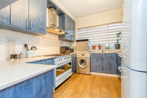 The kitchen is as functional as it is beautiful. Bluish-grey cabinetry is complemented by Caesarstone countertops, sleek stainless-steel fittings and crisp white splash backs. At the heart of it all, a Smeg 6-plate gas hob and oven which speaks to both form and functionality, ready to elevate every meal.