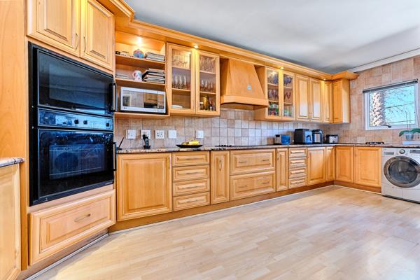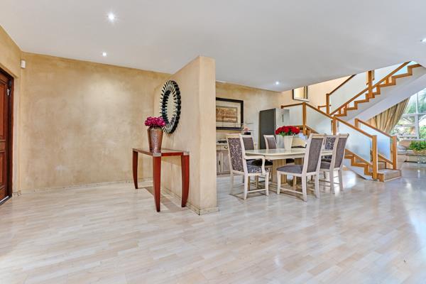Impressive huge front door opens to a bright entrance hall, guest toilet, elegant kitchen with scullery, open plan dining room, double-volume lounge and tv room, all leading to a covered patio and low maintenance garden.