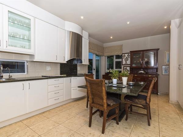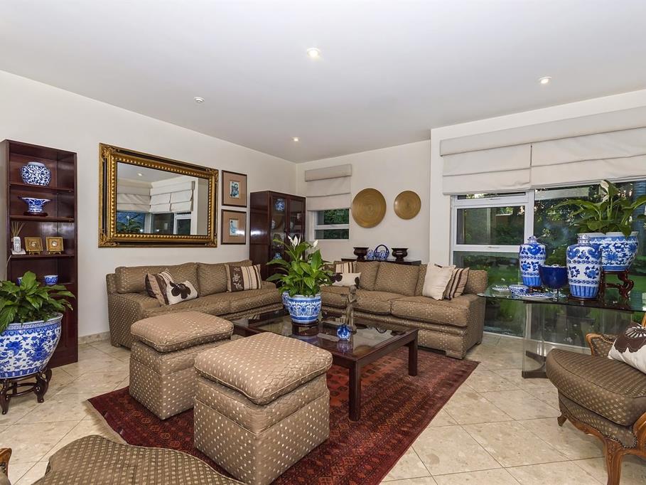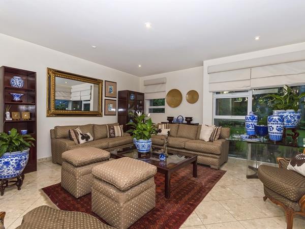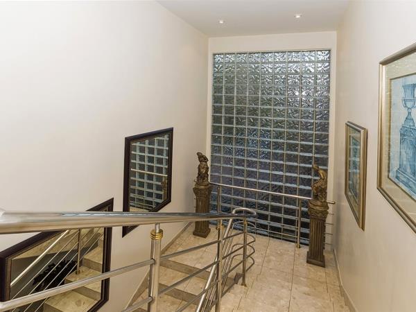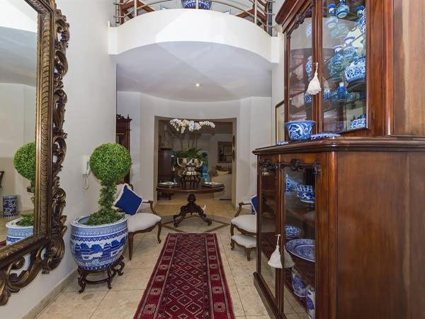 The ultimate in glamour and sophistication a timeless classic design created for the owners by renowned architect Italo Lupini. The moment you enter the magnificent glass front door you will feel the quality and style this exudes, master crafted with the finest finishes, double volume ceilings, marble floors and vanities, spacious reception rooms flow out to covered patio, beautifully manicured garden with cycads, palms trees, ferns and cascading pool. Gourmet kitchen, guest cloakroom and study. Courtyard with braai area. Upstairs to landing, massive pyjama lounge, 3 bedrooms en suite- exceptional master bedroom with dressing room and bathroom. Double staff suite, 6 car garage with loads of off road parking.