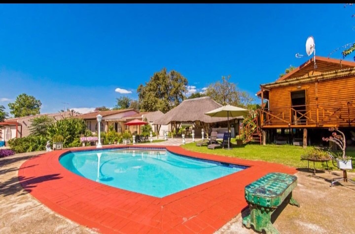 The outdoor area is a true highlight, designed for extensive enjoyment. It features a large swimming pool, perfect for cooling off, complemented by a spacious thatched lapa ideal for entertaining guests. Lush green gardens and a private patio create a serene environment.