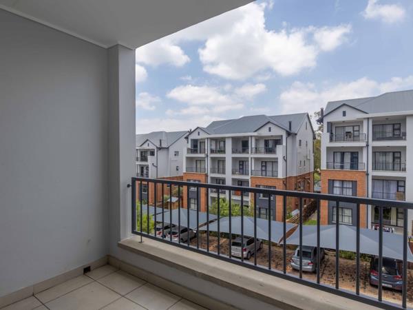 The apartment is filled with natural light, creating a warm and inviting atmosphere. The kitchen is both stylish and functional, featuring Caesarstone countertops, ample cupboard space, and includes two appliances along with a single-door fridge. The open-plan layout seamlessly connects the kitchen to the lounge, which flows onto a private balcony offering stunning estate views.