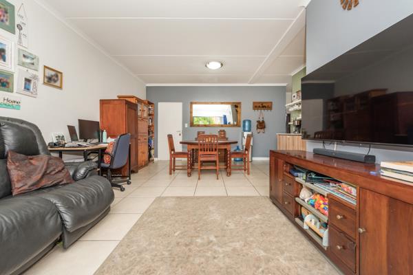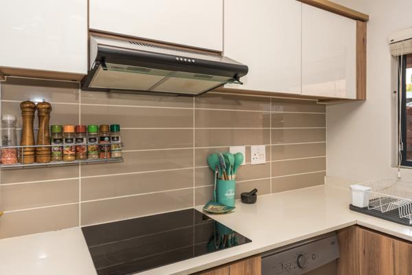 The kitchen is sleek and functional, boasting Caesarstone countertops, an electric hob, oven, and extractor fan, ideal for home cooks and entertainers alike. Included in the sale are the fridge, dishwasher, washing machine and tumble dryer. The living area opens up to a covered patio overlooking the beautiful garden. The patio and lounge connection creates a seamless indoor-outdoor living experience that maximizes natural light and space.