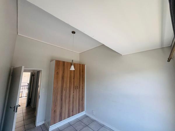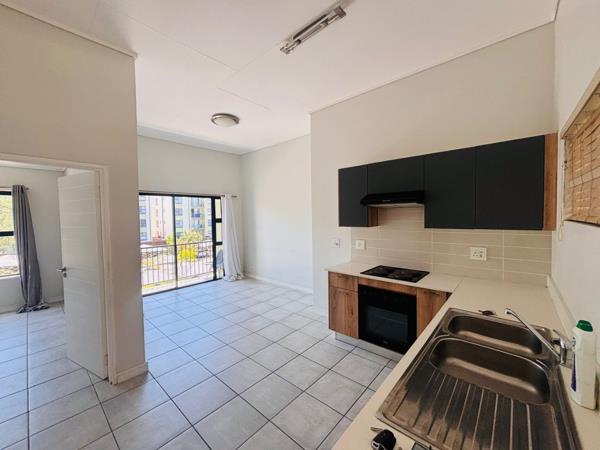 A stunning tiled bachelor Apartment with an open plan built in cupboard kitchen and lounge, has a stove. A shower. A balcony with a sliding door. on the third floor.
