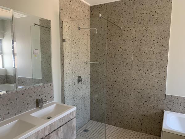 This unit features a private, open-plan layout. The spacious bathroom fitted with a shower, bath, double basin and loo. The U-shaped kitchen, finished with: granite tops, washing machine, fridge, stove, oven, extractor fan, tiled backsplash and a volume of light wood cupboard space lays open plan with the cosy lounge area with sliding doors leading onto a private balcony. The 2 bedrooms are off the passage with the shared bathroom. The bedroom is well sized and has a multitude of built-in-wardrobes.
