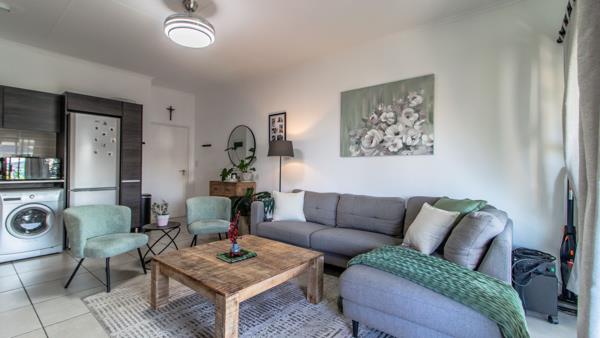 This elegant home boasts a seamless open-plan design, where the expansive lounge flows effortlessly onto a private balconyideal for morning coffees or sunset relaxation. The stylish kitchen is superbly appointed with premium appliances including a gas hob, electric oven, dishwasher, and tumble dryer (all sold Voetstoots), blending practicality with sophistication.